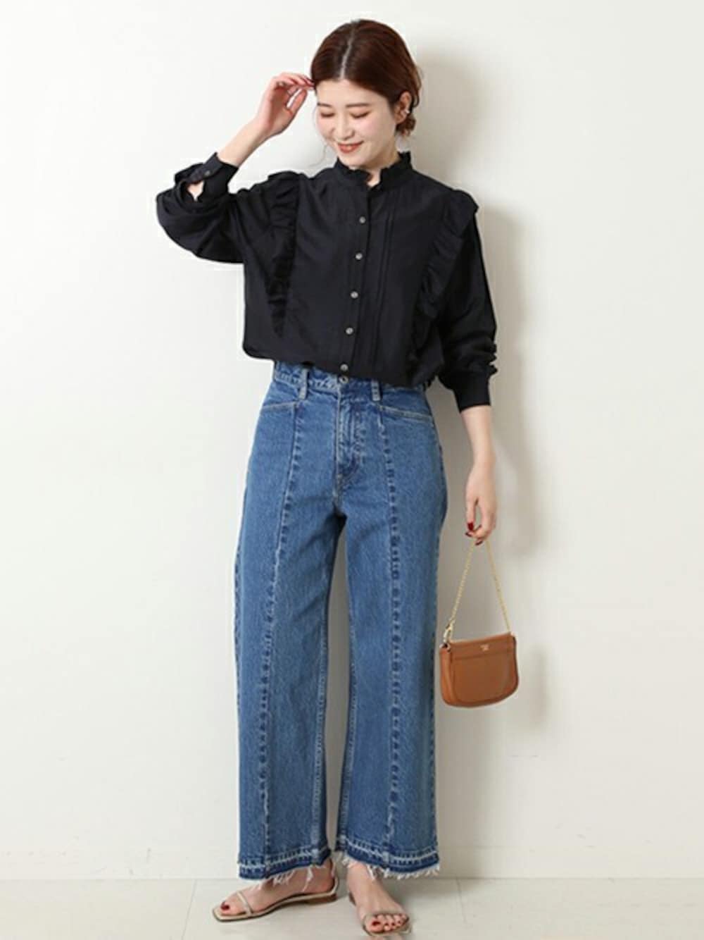 20代後半 / 身長:160cm / イエベ オータム / ストレート / 普段サイズ:36~38 フリルブラウスもダークトーンでシックな印象に。 大きすぎないフリルなので挑戦しやすいアイテムです! 足元のメタリックサンダルやチェーンバッグで上品さもプラス。 デニムは足首がみえる着丈でこれからのシーズンにピッタリです◎