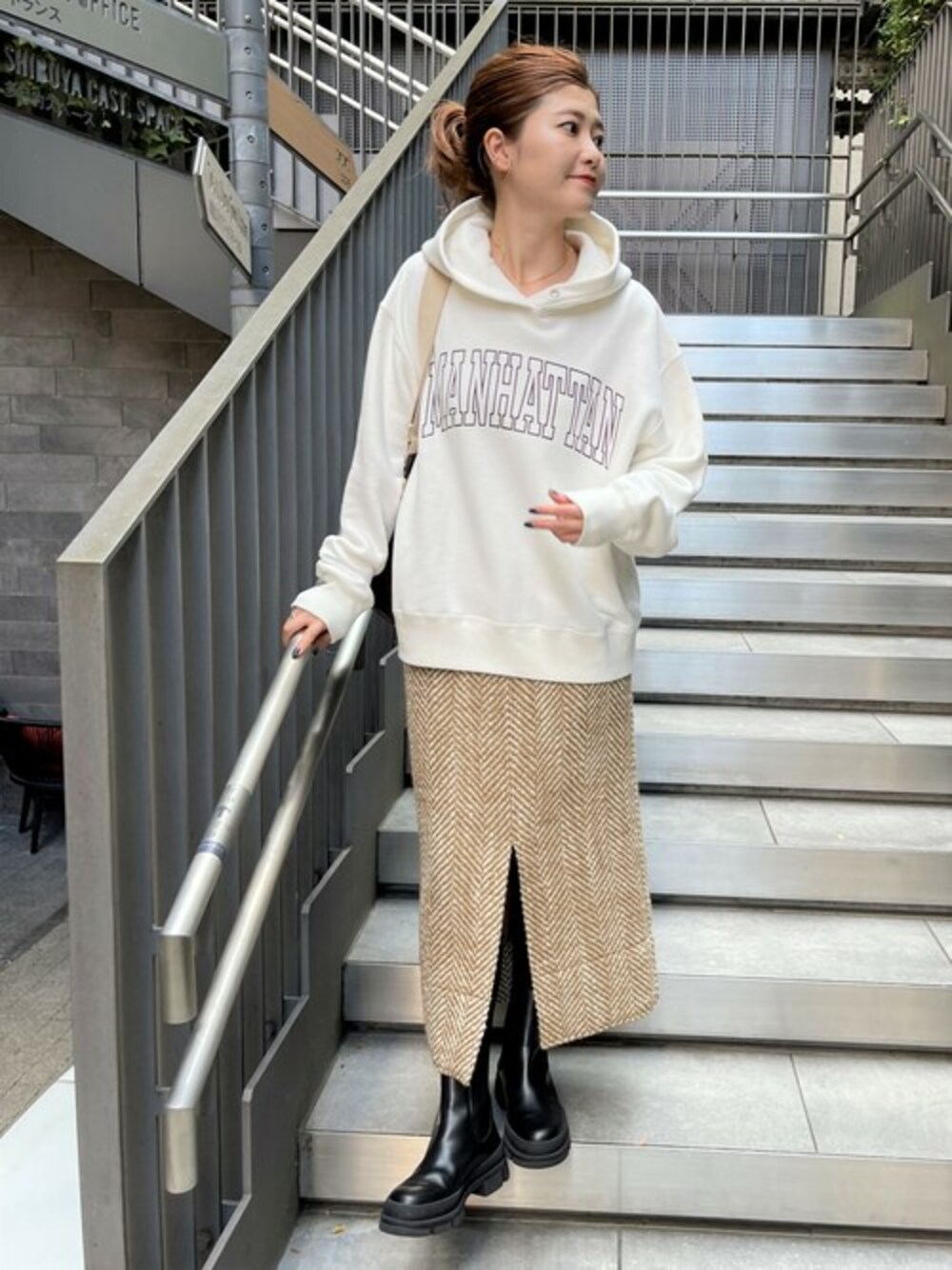 30代前半 / 身長:160cm / イエベ オータム / ストレート / 普段サイズ: 36~38 秋冬シーズンに大活躍のロゴスエット。 ヴィンテージのような風合いがありつつも、ホワイトでクリーンな印象に。 カジュアルなチノ素材のスカート合わせも大人な雰囲気にきまります。 足元はボリュームのあるサイドゴアブーツで、今年らしいバランスに仕上げるのがポイント。 ※着用シューズのサイズについて:着用しているシューズはサンプルの為、モデルが普段着用しているサイズではございません。