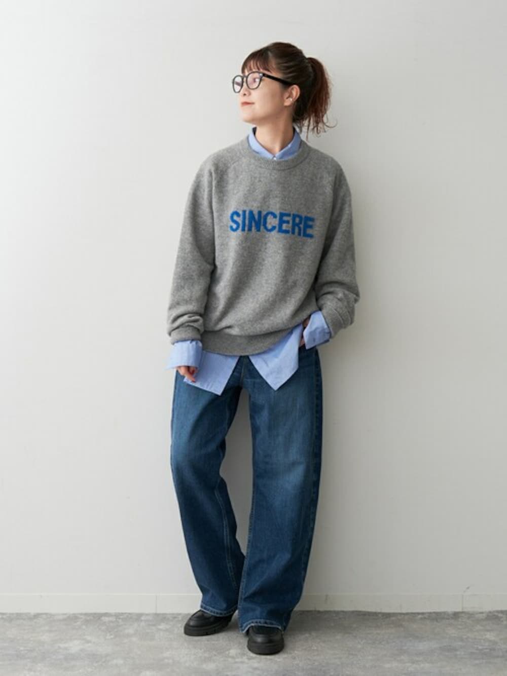 スウェット感覚で着られるロゴニット。 程よくルーズなサイズ感&厚手すぎない生地感で、レイヤードスタイルにもぴったりな一枚。 すっきりした丈感なので、引き続き気分なワイドパンツとの相性も抜群! ロゴに合わせてさりげなくブルーのアイテムでまとめてみました◎ ※着用シューズのサイズについて:着用しているシューズはサンプルの為、モデルが普段着用しているサイズではございません。