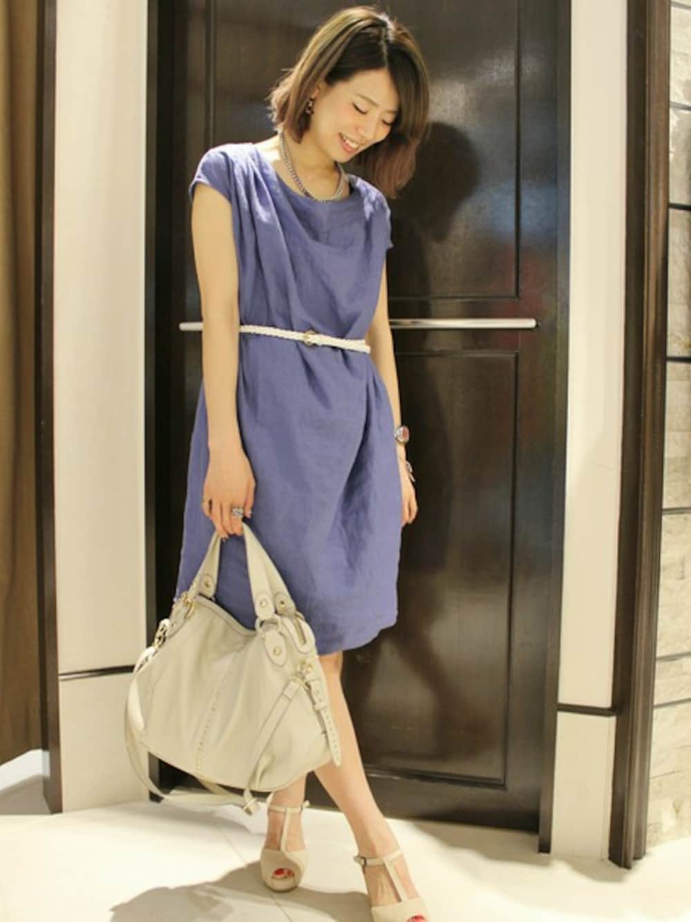 リネン素材のドレープワンピースにホワイトを合わせて清涼感アップ。 ベルトでウエストシェイプさせたシルエットとショートネックレスで女性らしい印象を出しています。