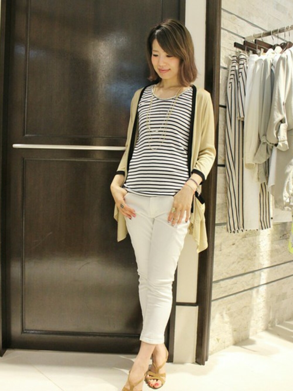 カットソー素材の柔らかな素材感のカーディガンは、ホワイトサブリナとボーダーでマリンテイストに着こなして。 ラインストーン使いでリッチな印象に。
