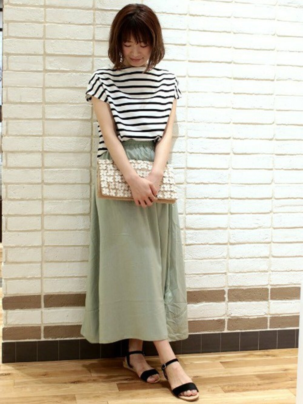 ☆キュートカラーのマキシスカート&ボーダー 程よい光沢とマスカットグリーンがさわやかなマキシスカートは、 リバーシブルで履ける優秀アイテム。 デイリーならコットン素材のボーダーTシャツにさらりと合わせるだけでもOK。 遊び心のあるGOODSをプラスすれば気分も上がります!