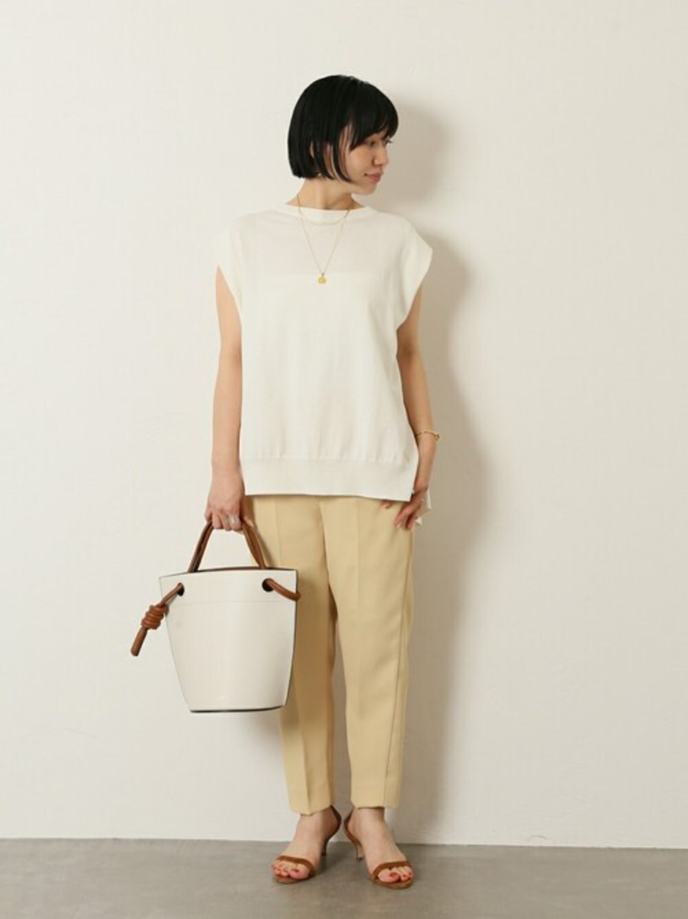 クリーミーなイエローが可愛いPeスパンツイルパンツを、きれいめシンプルに。 ホワイト合わせをするだけ、明るく爽やかに。 全体的に淡い、ペールトーンのような色合わせなので、優しい印象になりますよね。 小柄さんは、ぜひヒールで合わせるとスタイルアップします。
