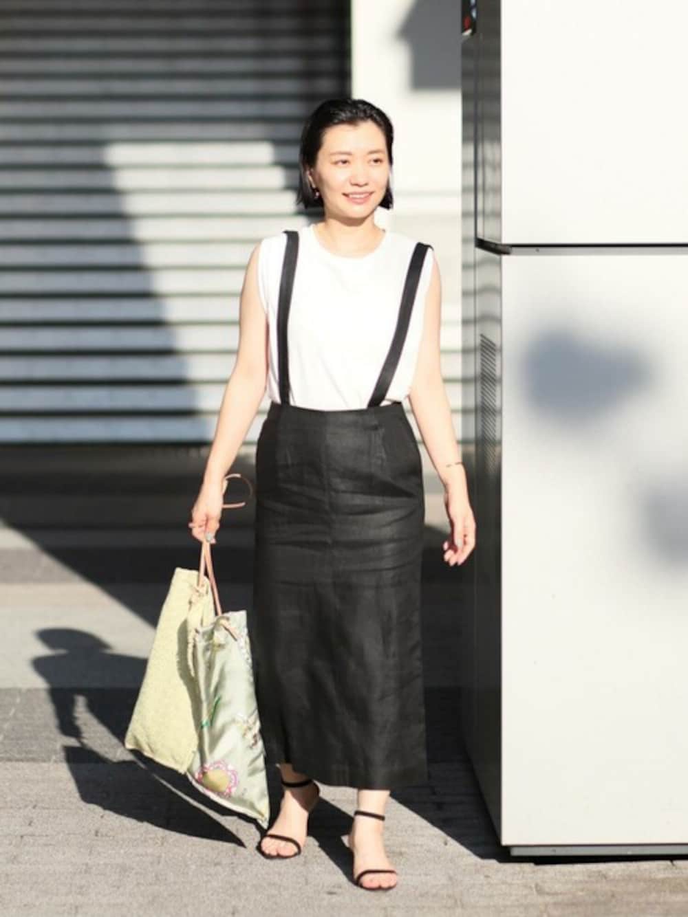 リネン素材で涼しく着られる サロペットタイトスカートは、 シンプルなカットソーを合わせるだけでコーデが完成する 夏のおしゃれのマンネリ回避にぴったりのアイテム。 タイトなシルエットではありますが、 体のラインを拾いすぎないストンと落ちるシルエットなので 気負いなく取り入れられるのもポイント。