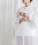 バンドカラーシアールーズシャツ シンプルだけどこだわりの詰まった大人シアーシャツ <デザイン> カジュアルすぎない大人にこそ着て欲しいルーズシアーシャツの入荷です。 丈はトレンドのロング丈でサイドに深いスリットが入ることで横からのシルエットをスッキリ魅せてくれます。 生地はフラットな生地を使用しているので形はカジュアルだけどきちんと感のある優れもの◎たっぷりな腕回りとボリューム袖でまくると抜け感のあるスタイリングが完成します。 <スタイリング> キレイめパンツでオフィスにも◎デニムにシャツの前を開けて大人カジュアルにもボトム次第で雰囲気が変わる着回し力抜群のアイテムです。
