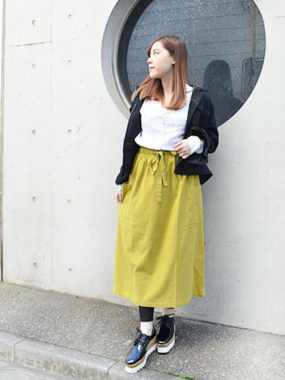 お気に入りのブラック×イエローコーデ💛 よく履いてる厚底オックスフォードシューズは美脚に見せてくれます✨