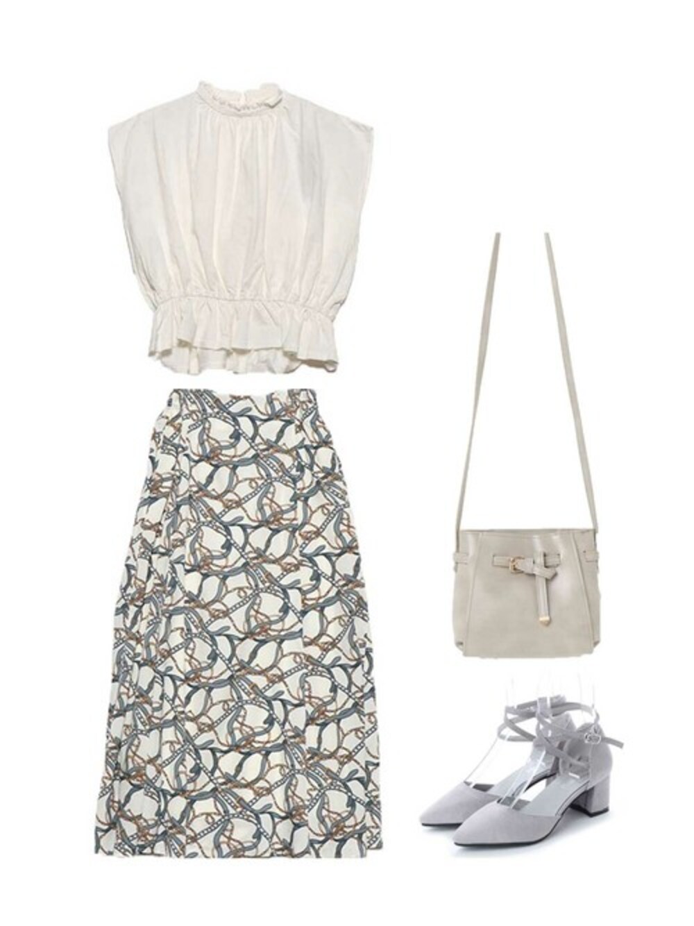 スカーフ柄で大人清楚な印象のコーディネート♪ 全体をグレー、ホワイトでまとめることで統一感UP💎 レースアップパンプスは太めのヒールで歩きやすさも抜群です!