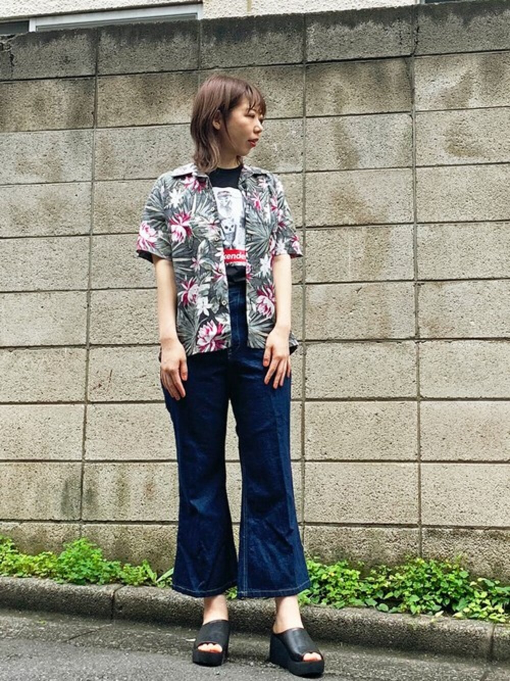 メンズで人気のアイテムの ・開襟アロハシャツ ・ガールフォトプリントTシャツ を着用してみました👖 女性も着ることができるユニセックスアイテムです😉♥ カップルでリンクコーデも楽しめます♪