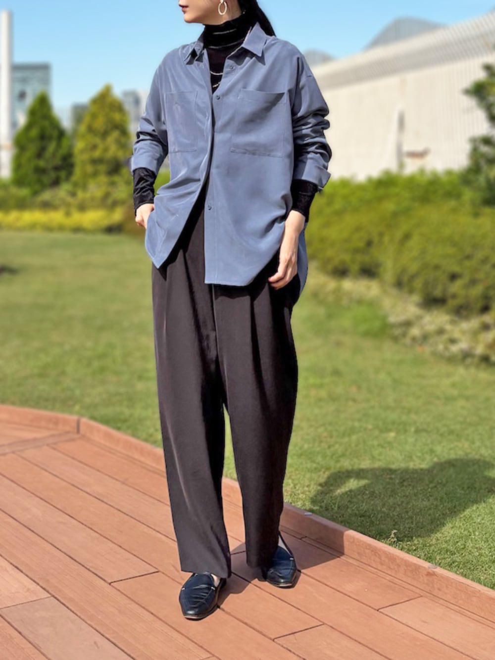 ☑︎ パウダータッチ素材で肌にすっとなじむ💖 ☑︎ シアーベロアが叶える上品な肌見せ✨ ☑︎ 美シルエットでストレスフリーなサテンパンツ🦢 今回は、洗練された印象のシャツを主役にした、秋のレイヤードスタイルをご紹介します🍁 パウダータッチシャツは、ICHIEの微起毛素材が肌に心地よく、長時間の着用でもストレスフリー。とろみと落ち感で抜け感を演出しつつ、シャープな襟元がきちんと感をプラスします。 インナーには、繊細な光沢と透け感が魅力のシアーベロアハイネックプルオーバーをチョイス。クラシカルなムードを演出してくれます。 羽織ったダブル釦ジャケットは、メンズライクながらコンパクトな作りで合わせやすい一枚。 ボトムスは、ICHIEの美しい落ち感が魅力のサテンイージーパンツ。ウエストゴムで快適ながら、美シルエットできちんと感をキープし、通勤スタイルまで幅広く活躍します💐