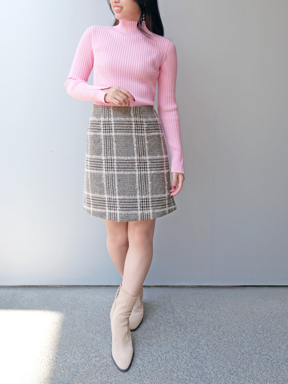 ☑︎ シェルストレッチ素材でシルエットが綺麗!袖口リブニット💯 ☑︎ セミタートルで顔周りすっきり!インナー/一枚着で活躍🙌 ☑︎ 貴重なダブルフェイス!モヘアループで立体感を効かせたミニスカート✨ ICHIE(イチエ)の万能ニットと、温かみのあるチェックミニスカートを合わせた、フェミニンなコーディネートです😊。 トップスは、ICHIE(イチエ)の袖口スリットリブニット✨。 程よいリブ感とシェルストレッチ素材で、インナーとしても一枚でも美しいシルエットで着用できる万能アイテムです💖。 セミタートルネックデザインが、お顔周りをすっきり見せてくれます🙌。 ボトムスは、ICHIE(イチエ)のフラッフィ―チェックミニスカート🌸。 トラッドなグレンチェックに、温かみのあるモヘアループ糸で立体感をプラスした、フェミニンで上品な素材感です😌。 大変貴重なダブルフェイス生地を使用しており、上品かつ高見え💯。流行り廃りのない台形シルエットで、秋冬のコーディネートのアクセントになること間違いなしです💫。