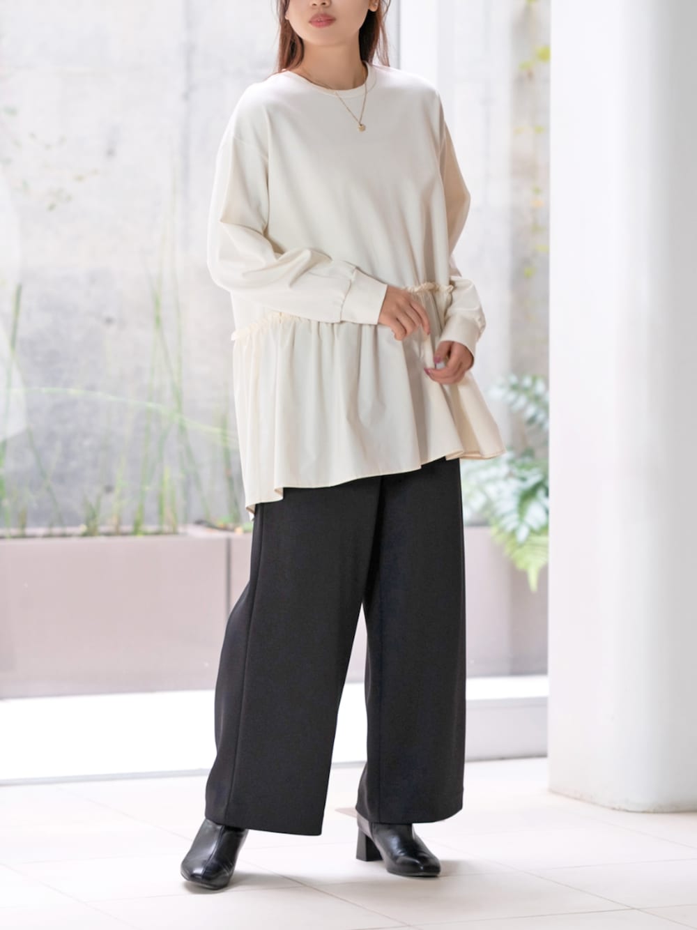 ☑︎ ビスポンチとタフタの異素材ドッキングが表情豊かな着映えデザイン👍 ☑︎ 柔らかジャージ仕立てでストレスフリータフタのふんわり感が優雅に演出✨ ☑︎ カジュアルときれいめの絶妙なバランスでデイリーコーデを上品に格上げ🎀 程よいハリ感のあるビスポンチ素材に、軽やかなタフタをドッキングしたプルオーバーです😊 異素材ミックスが表情豊かで、シンプルながら一枚で着映えするデザインです💕 身頃は柔らかくストレスフリーなジャージ仕立てで、タフタ部分のふんわりとしたシルエットが女性らしい優雅なニュアンスを演出🙌 カジュアルさときれいめのバランスが絶妙で、デイリーコーデを上品に引き立ててくれます🌟 さらりと着るだけでスタイルが完成し、季節の変わり目から長く活躍する一枚です🌸