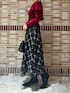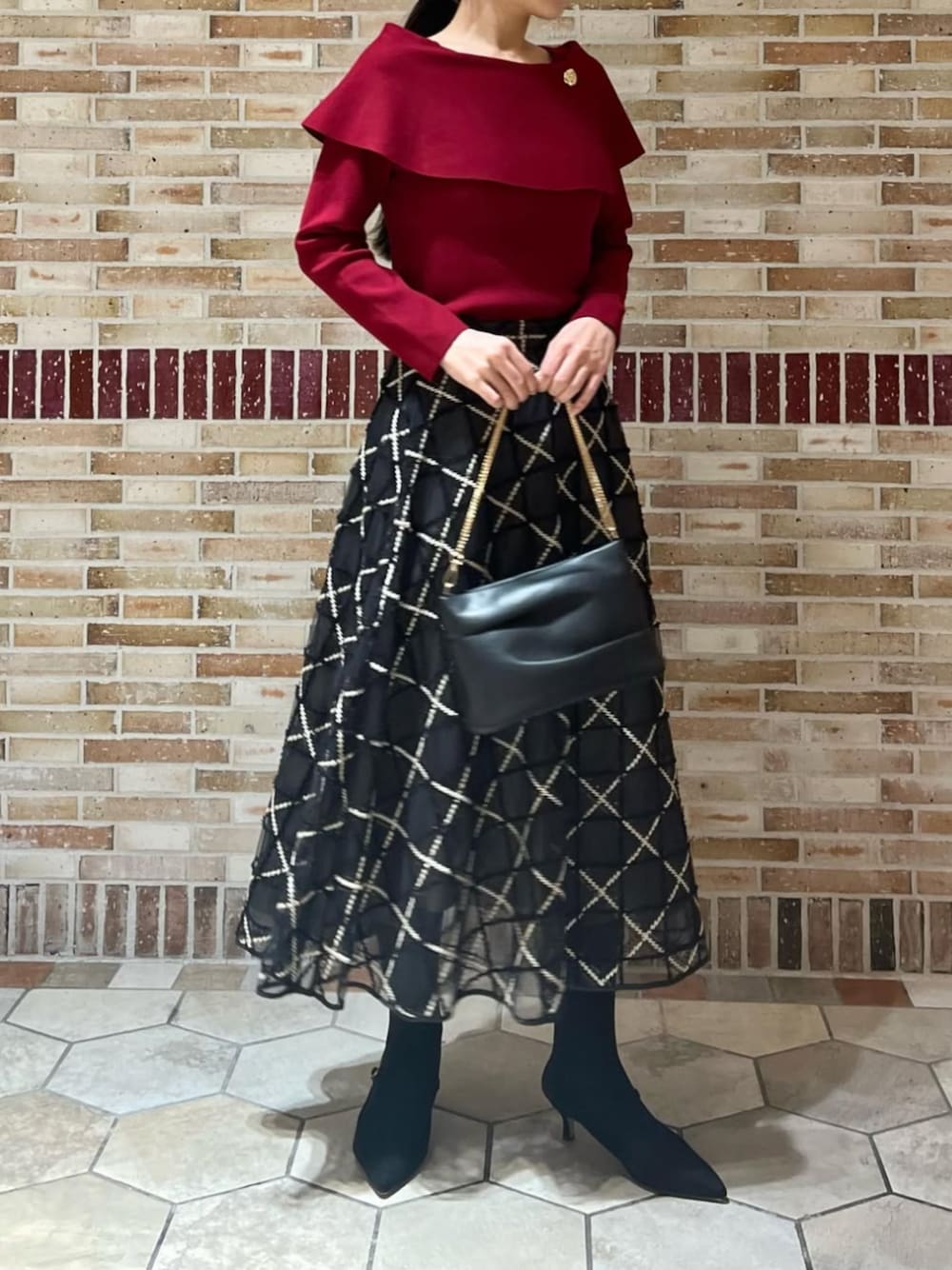 〈ダイヤカラットチュールスカート×釦付きケープ風ニット〉 ◆異なる4種類の刺繍糸を用い、ダイヤ柄とチェック柄を交差させて表現した、オリジナリティあふれるフレアスカート。 ◆刺繍による繊細な凹凸感に、ふんわりとしたチュールとスパンコールの上品な煌めきが重なり、着るだけで映える華やかさを演出します。 ◆トップスには、ほどよいハリ感としなやかさを兼ね備えた上質素材のケープ風ニットを合わせて、フロントのボタンディテールがクラシカルなアクセントに。 ◆一枚で着映えしながら、ボトムを選ばず着まわしやすいのも嬉しいポイントです。 ◆特別な日のお出かけやセレモニーにはもちろん、シンプルなアイテムと合わせればデイリーにも活躍。 ◆STRAWBERRY-FIELDSらしい洗練されたフェミニンスタイルを存分に楽しめる、秋冬の主役コーディネートです✨