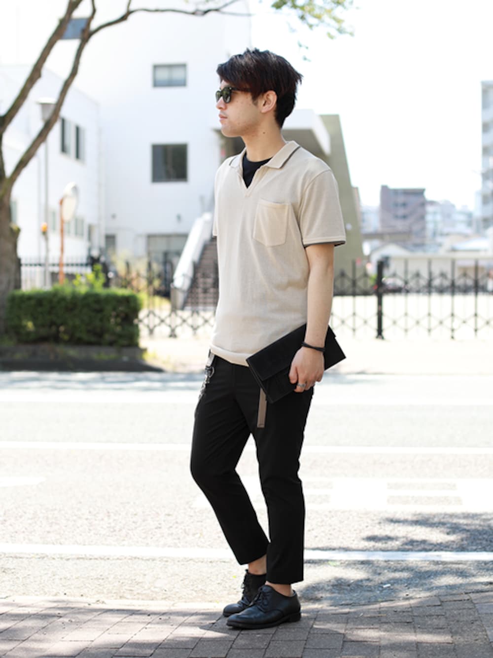 程よい抜け感と品のあるスキッパーポロをメインとしたスタイリング。 ラフになりすぎないようにパンツや小物は大人感あるアイテムでまとめました。