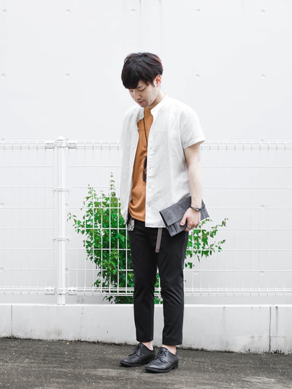 抜けのある襟元が特徴的なバンドカラーシャツ×テーパードパンツ。 鮮やかなカラーリングの無地TeeをMIXして、大人カジュアルスタイルに。 instagram : @shu_session