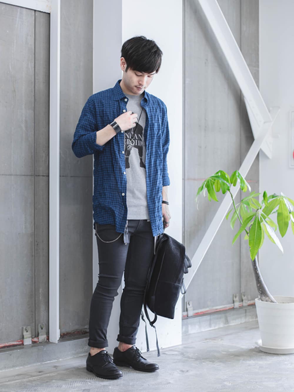 ギンガムチェックのロングシャツにチャコールのスキニーパンツ。 プリントTeeや小物をアクセントにした、大人カジュアルスタイルに。 instagram : @shu_session