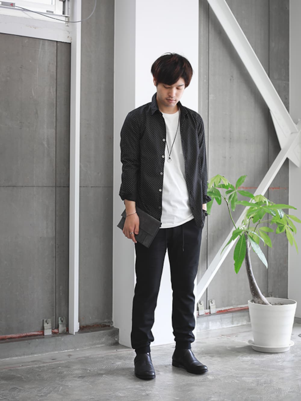シャープなシルエットの新型のドットシャツ。 イージーパンツを取り入れて、ラフな印象に仕上げました。 instagram : @shu_session
