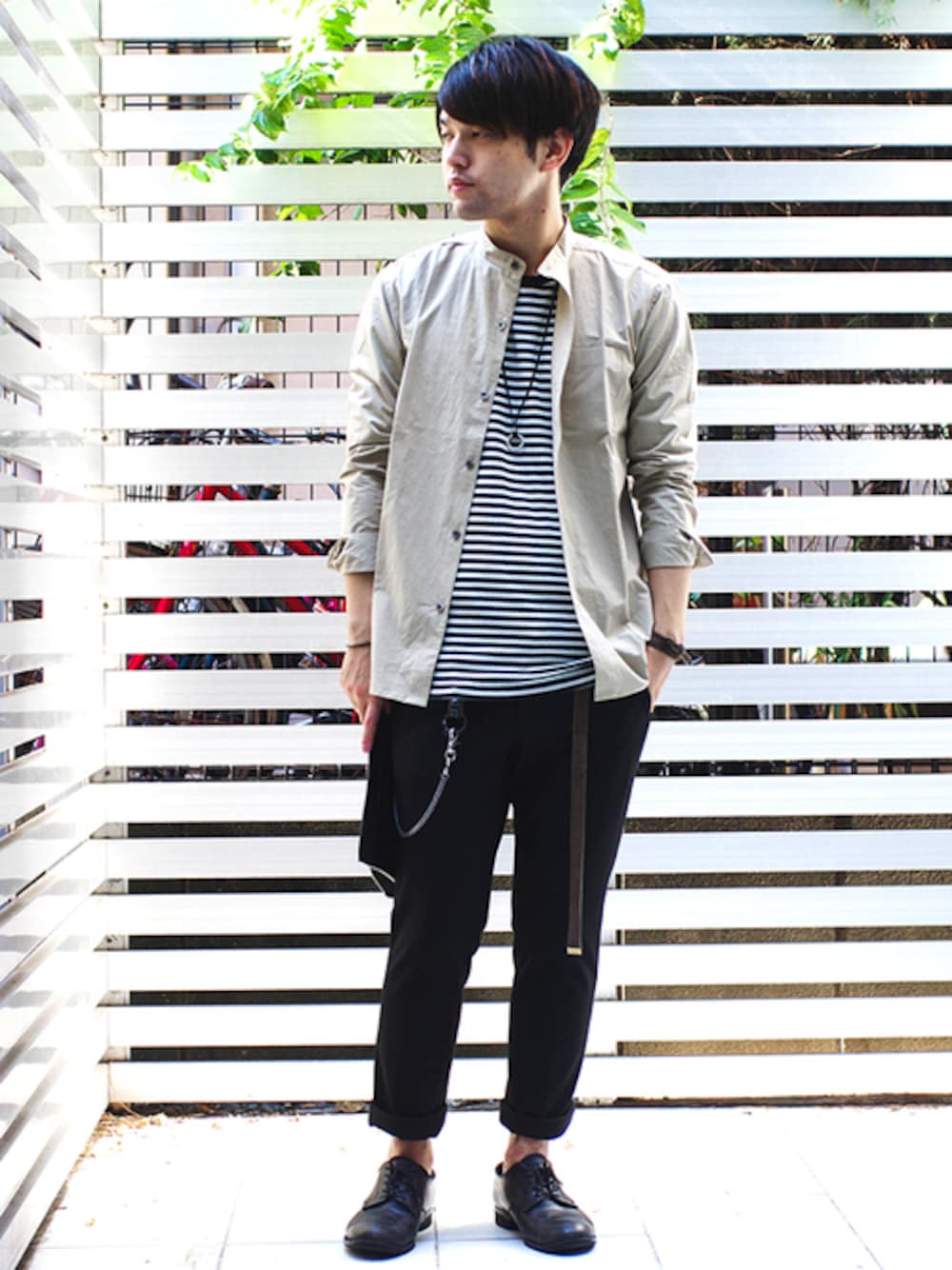 クラシカルな雰囲気のベージュのバンドカラーシャツ×新型トラウザーズ。 細ピッチのボーダーをMIXした、フレンチカジュアルスタイルに。 instagram : @shu_session