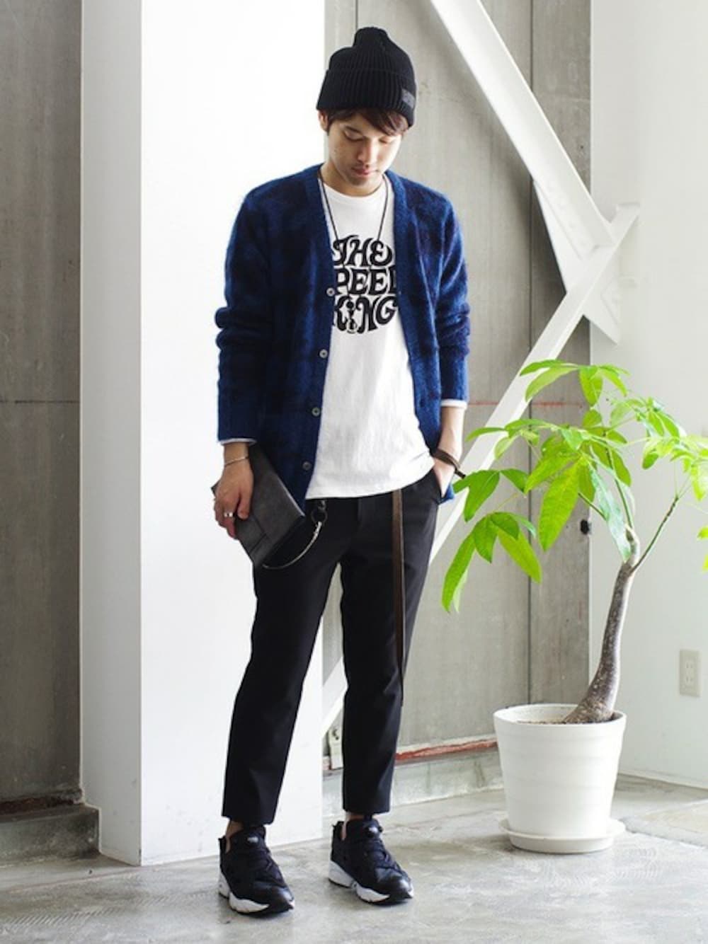 ハウンドトゥース柄のニットカーディガン。 ロゴTeeやジョッパーパンツでストリートライクなスタイルに。 instagram : @shu_session