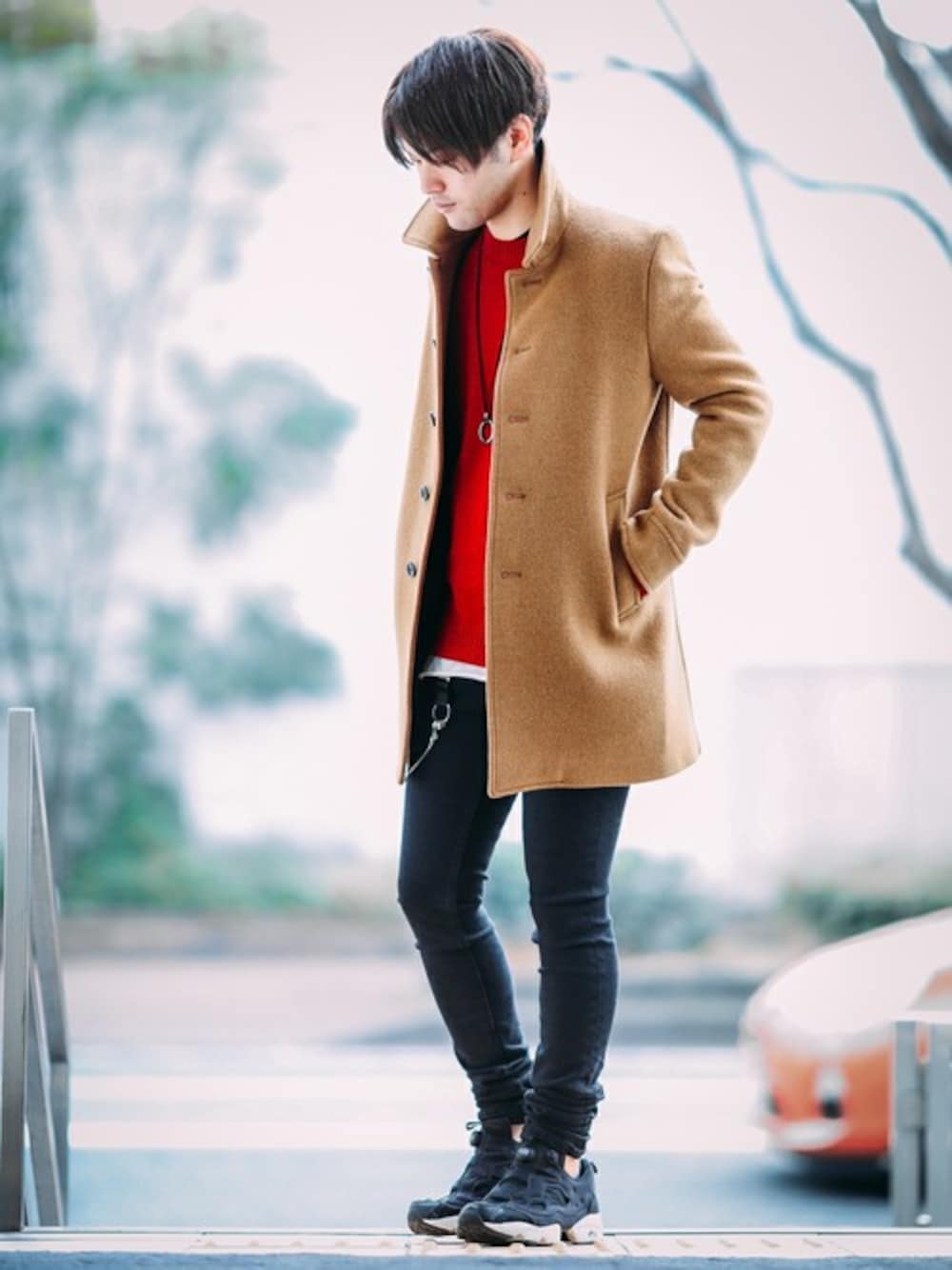 暖かみのあるシャギーな風合いに仕上げたステンカラーコート。 赤ニットや黒スキニーでシンプルな大人カジュアルスタイルに。 instagram : @shu_session