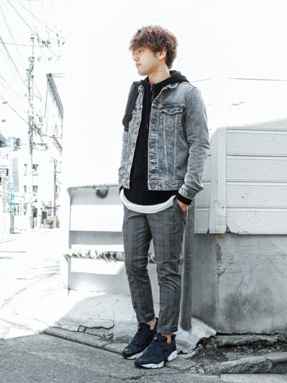 ケミカルウォッシュのGジャン×グレンチェックのスリムトラウザーズ。 インナーや小物はブラックでまとめてメリハリある印象に。 instagram➡︎ @shu_session