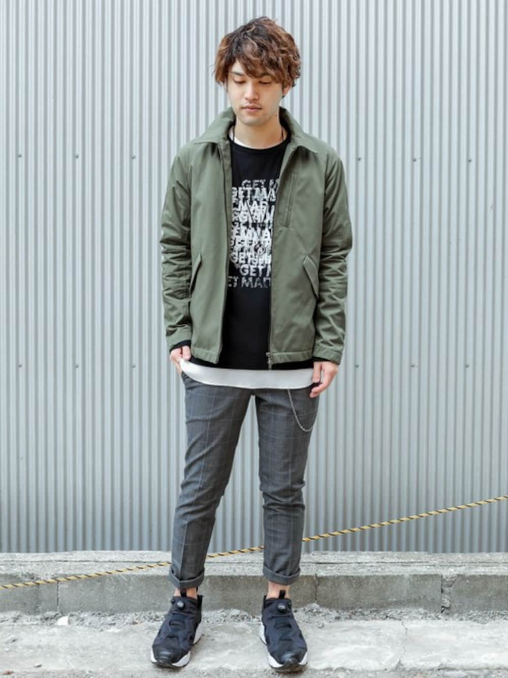 クリーンなフライトブルゾンにグレンチェックのスラックスを合わせたキレイ目スタイル。 ロゴTやスニーカーをMIXしてスポーティーな印象に仕上げました。 instagram➡︎ @shu_session