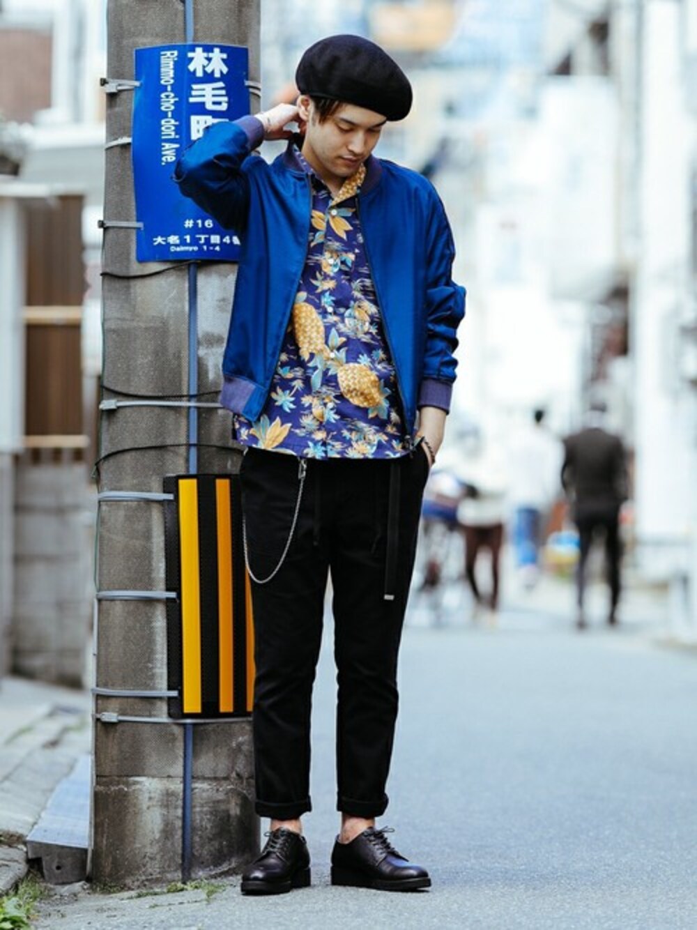 ブルーのスカジャン×アロハ柄のオープンカラーシャツ。 ベレー帽や短靴をプラスして知的な印象をプラス。 instagram➡︎ @shu_session