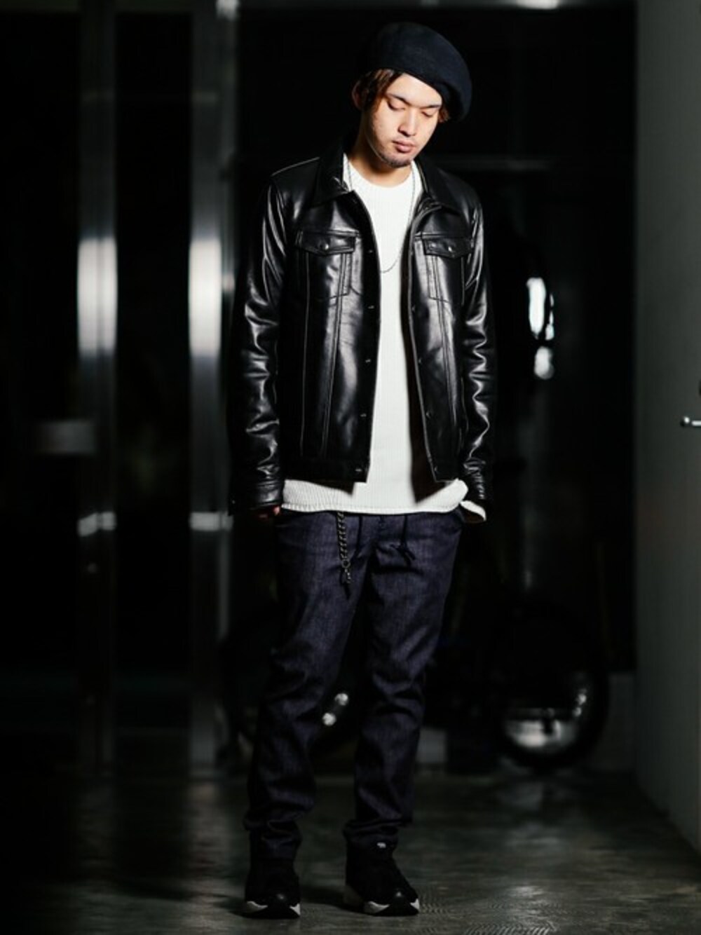 レザージャケットにニットを合わせたシンプルコーデ。 デニム素材のイージーパンツでラフさをプラス。 instagram➡︎ @shu_session