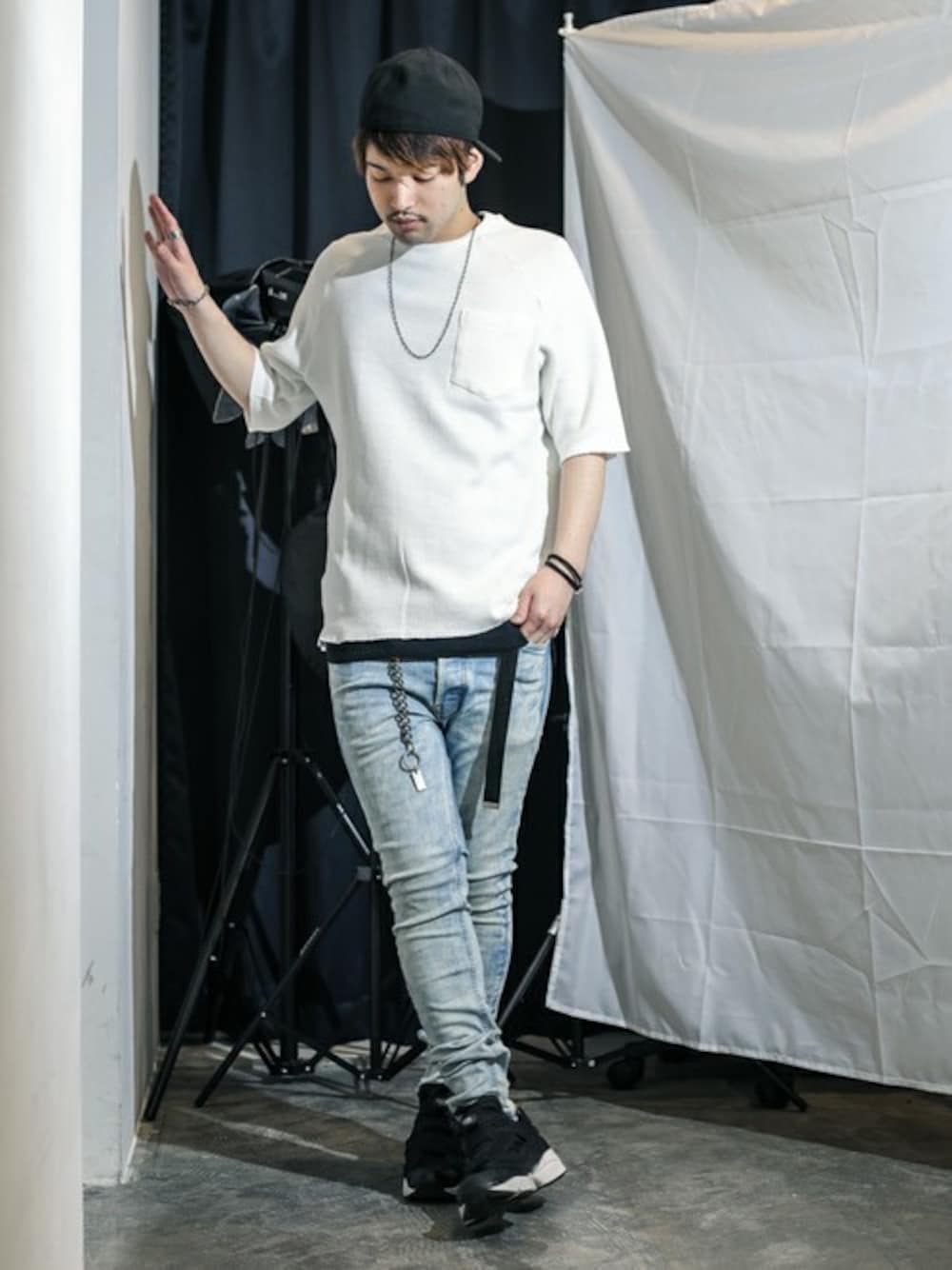 リラックスフォルムのサマーニットとライトインディゴのスキニーデニムを合わせたストリートコーデ。 instagram➡︎ @shu_session