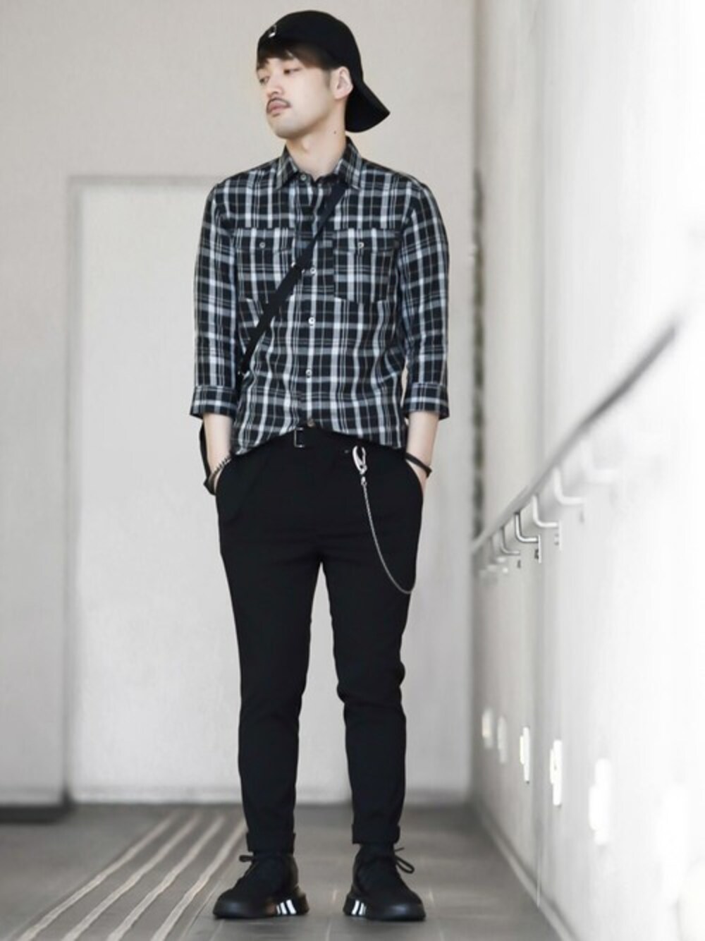 マットな質感の新型トラウザーズパンツ。 チェック柄を効かせた黒のワントーンでまとめました。 instagram➡︎ @shu_session
