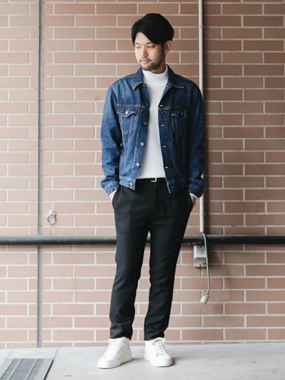 ヴィンテージ感のあるデニムジャケットを使ったスタイリング。 合わせ易いバランスのとれたサイズ感。 モックネックやスラックスなど、品のあるアイテムをチョイスして、 上品な印象に仕上げました。