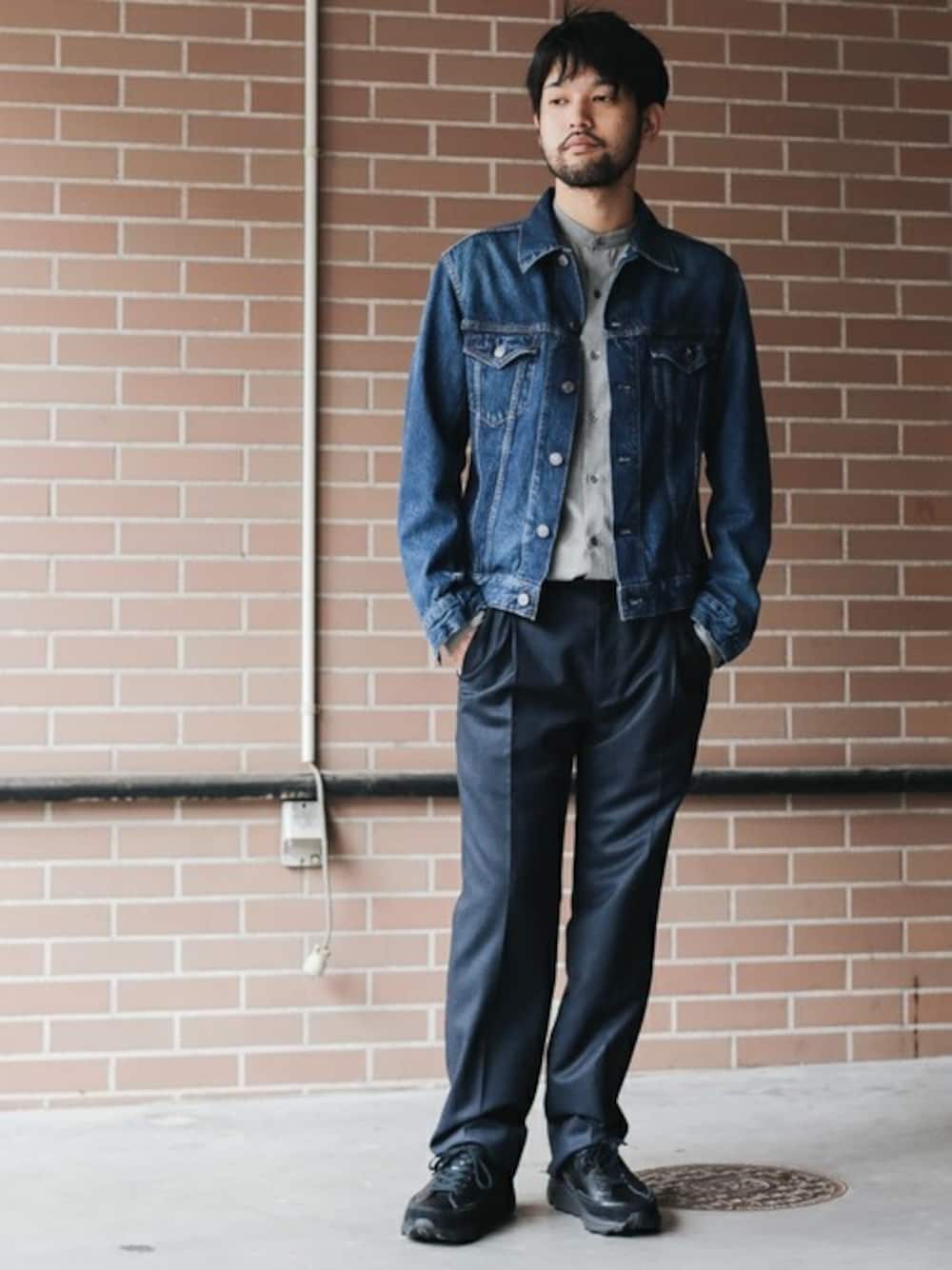 デニムジャケットを使った秋コーデ。 シャツやスラックスを取り入れて上品さをプラス。