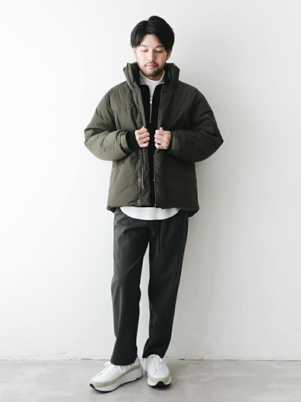 保温・撥水・防風性に長けた機能的なモンスターパーカー。 モックネックやスラックスで大人な印象に昇華。