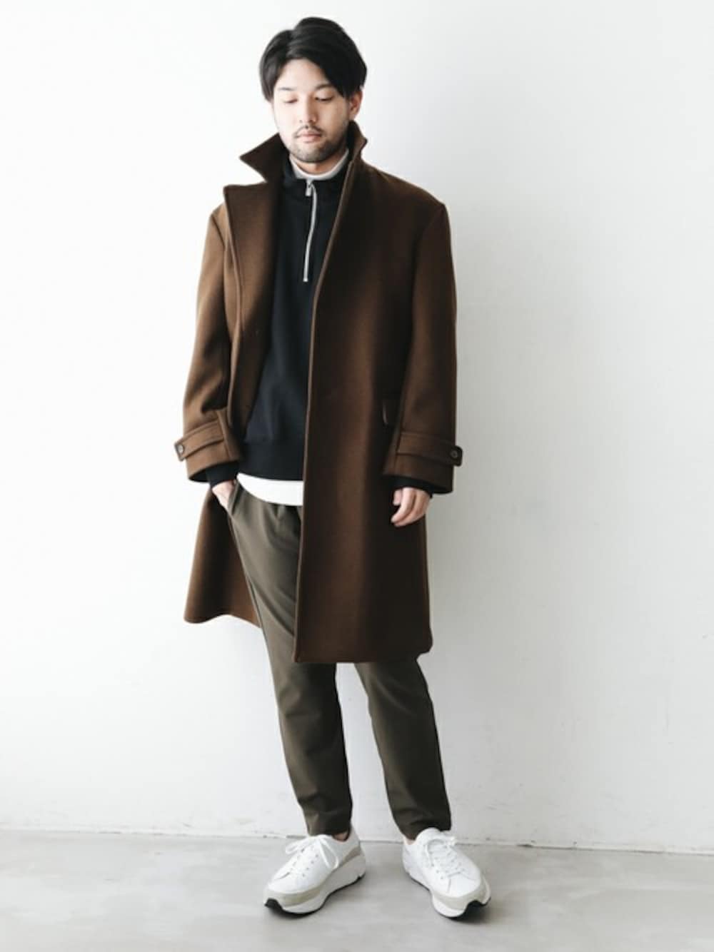 ブラウン×カーキのクラシックコーデ。 インナーにスポーツテイストのハイネックブルゾンを入れて、 抜け感を出しました。