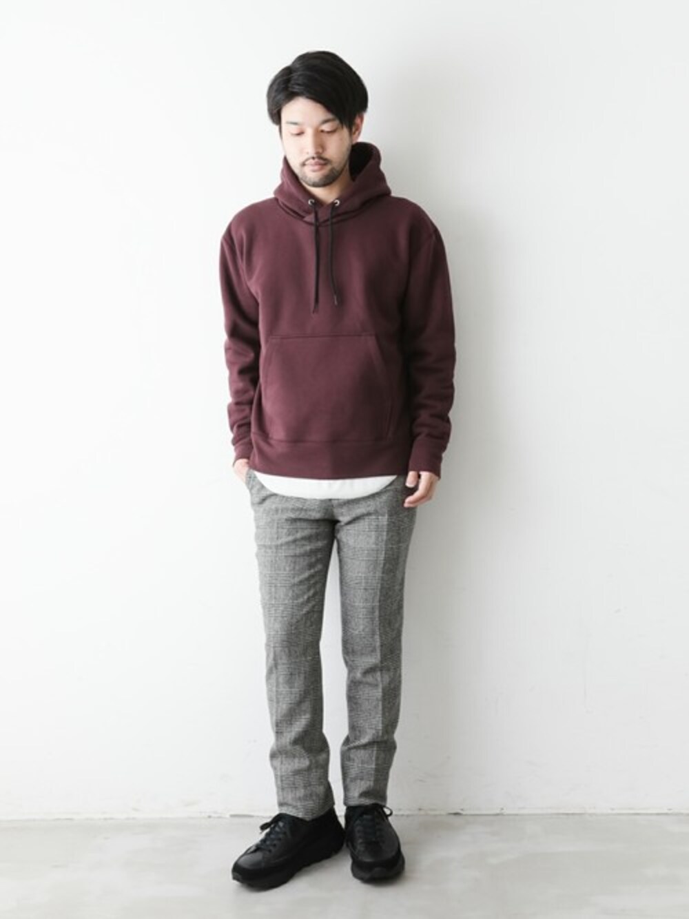 立体感あるフードが特徴的なプルオーバーパーカーを使ったシンプルスタイル。 チェック柄のトラウザーズで品の良さをプラスしました。