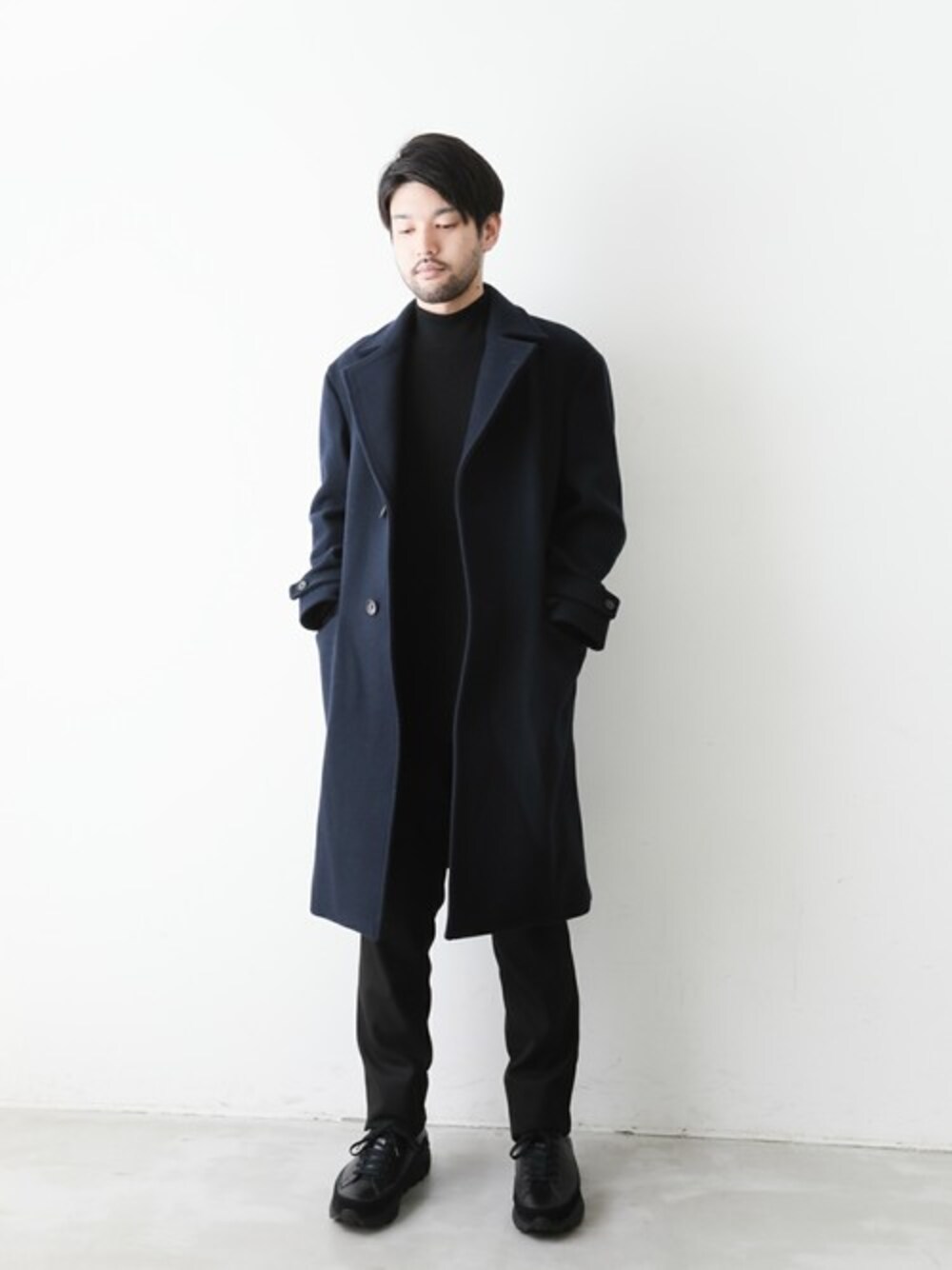 オーバーサイズのチェスターコート。 モックネックやスラックスで大人な印象に。