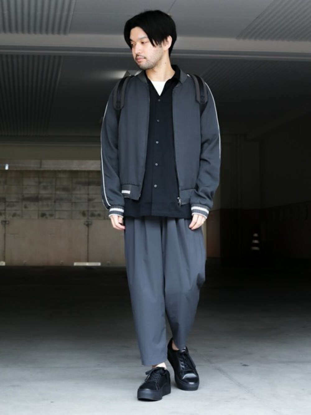 人気のMA-1を使ってスタイリング。 コンクリグレーのアイテムでまとめて都会的に。 MA-1はサイズ2(M)を着用。 シャツなどをレイヤードしても程よくゆとりのあるサイズ感です。