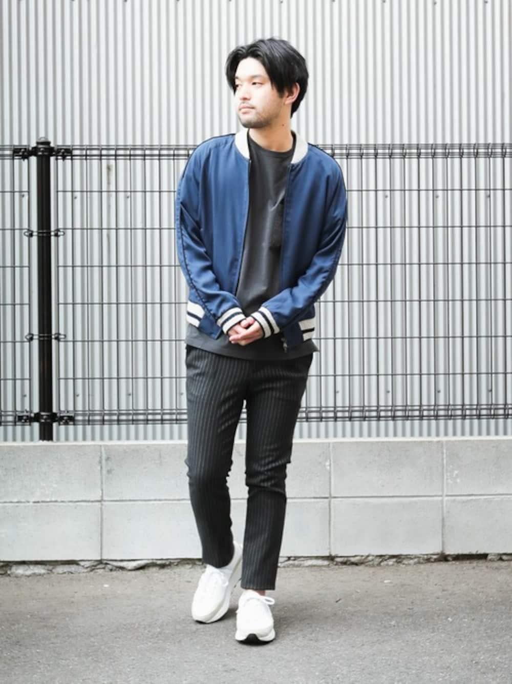 都会的な雰囲気のMA-1。 ストライプ柄のトラウザーズでクリーンな印象に。 身長170cmでMサイズを着用。 少しルーズに着るのが気分です。