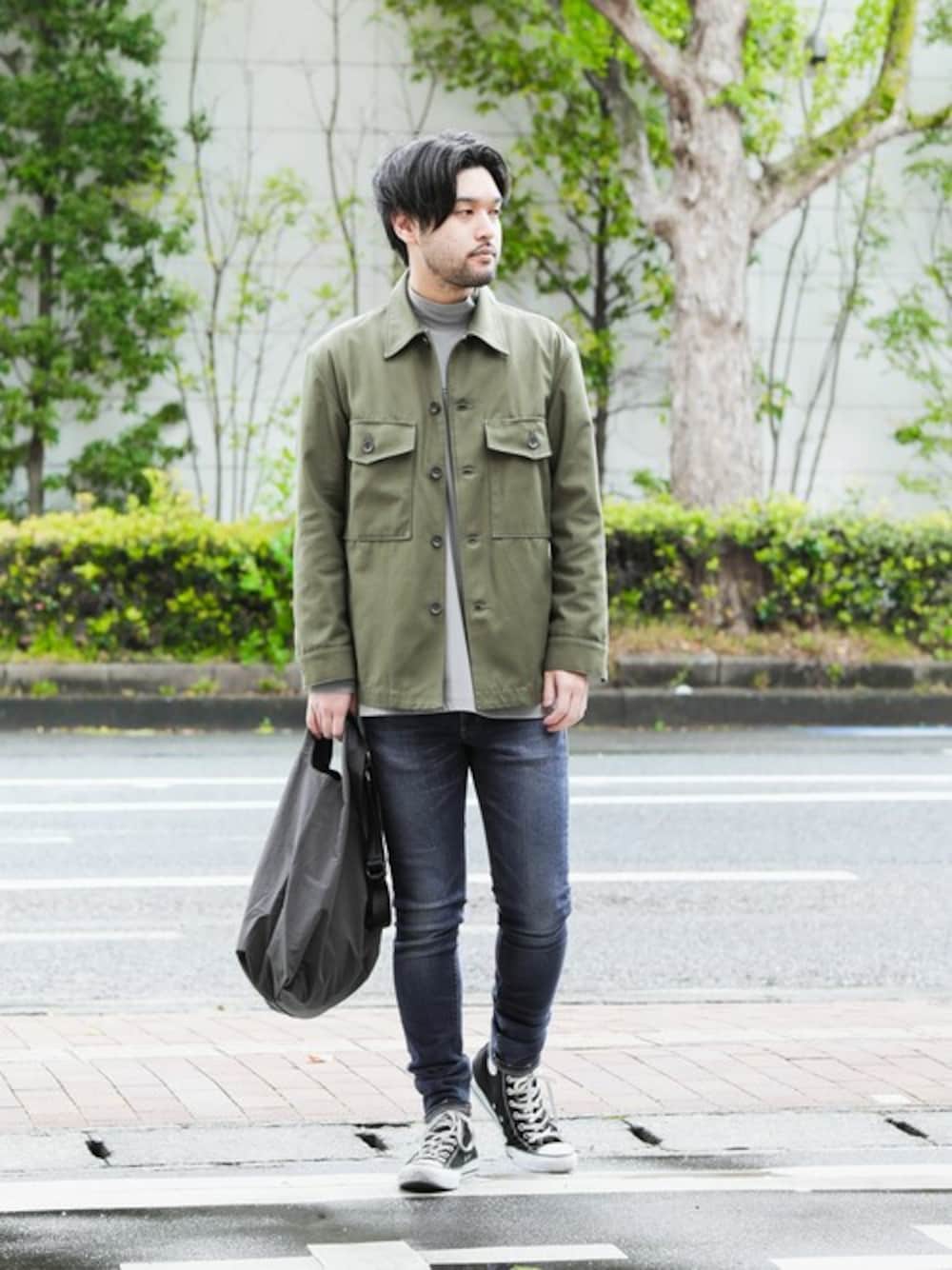 ミリタリージャケット×スキニーデニムのカジュアルコーデ。 インナーにモックネックを合わせてトレンドと上品さをプラス。