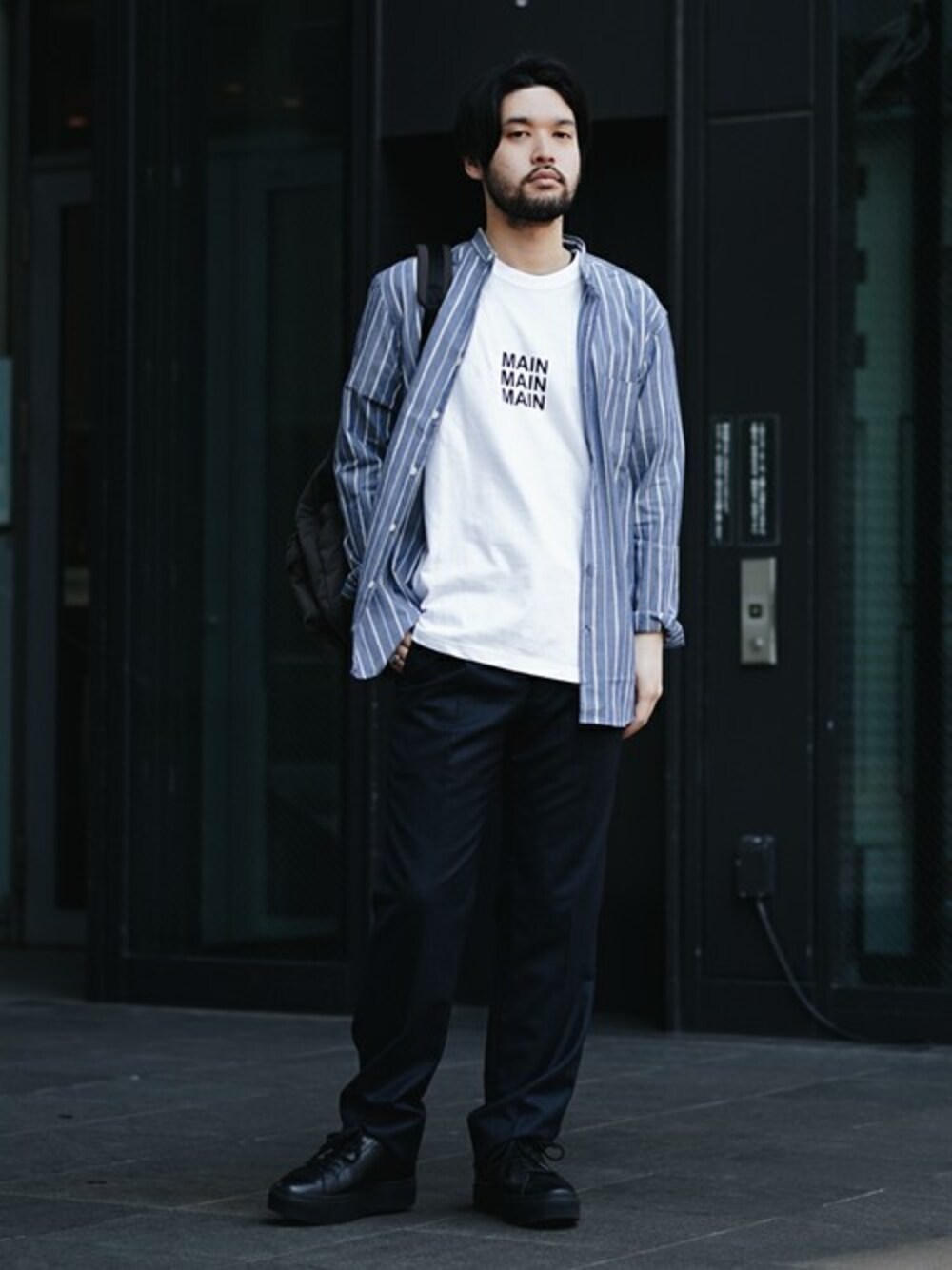 SHU KAWASAKIのシャツ/ブラウス「先染 NUANCE STRIPE スタンドカラーシャツ」を使ったコーディネート
