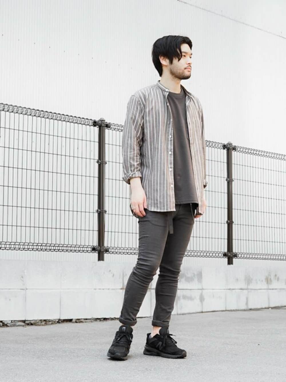 グレーベースでまとめた春のスタイリング。 ラフになりすぎないようにトップスはシャツを合わせて、 キチンと感をプラスしました。