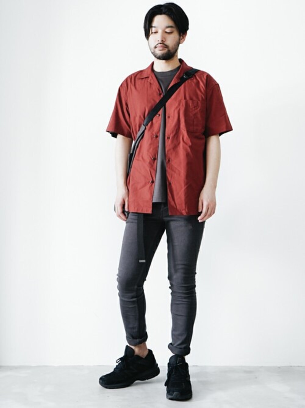 バーガンディーカラーのシャツを使った夏コーデ。 落ち着きある深めの色合いが新鮮です。 インナーとボトムはグレーで合わせて都会的な装いに仕上げました。