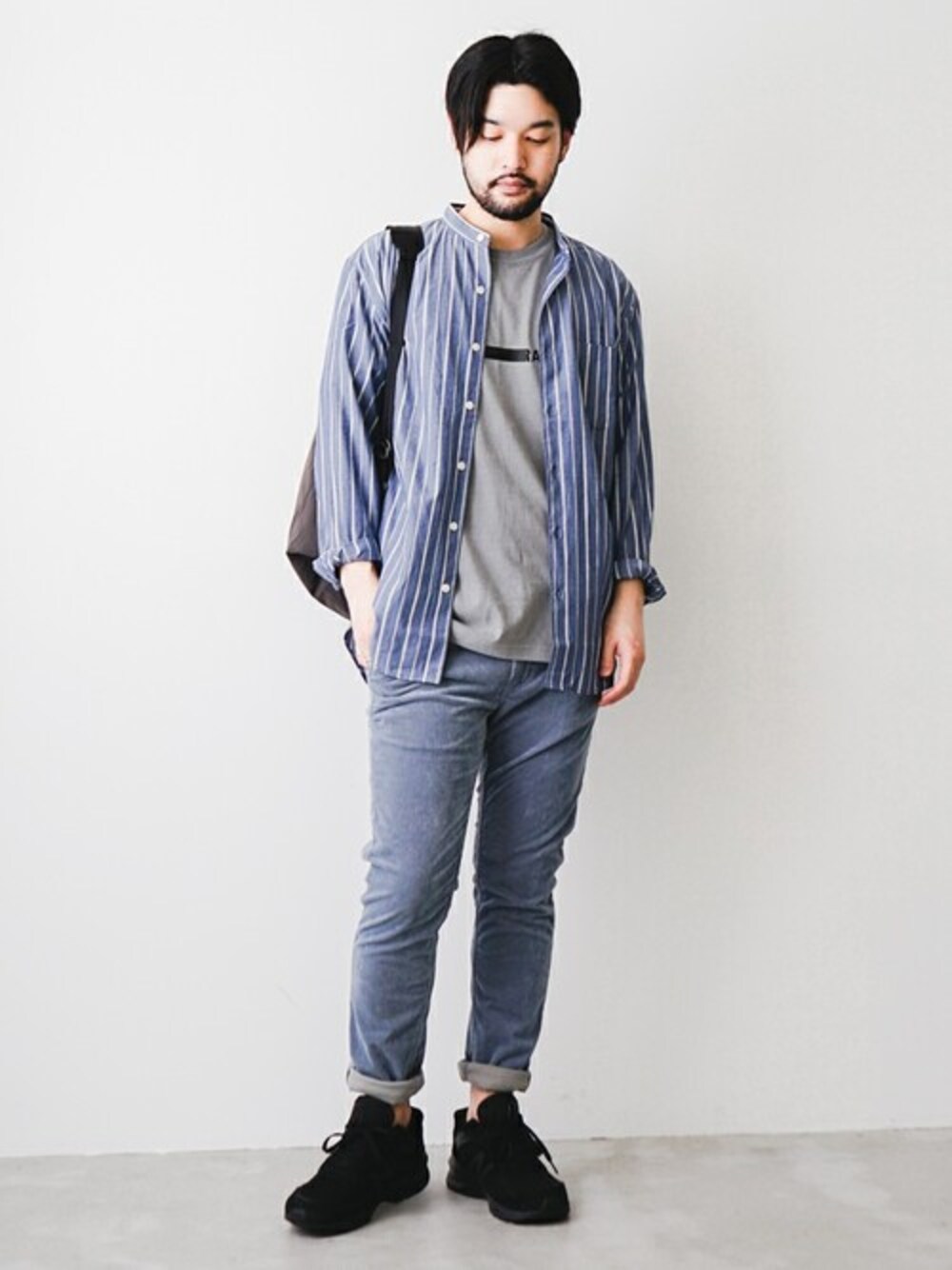 休日に着たい大人コーデ。 バンドカラーシャツはキチンと感と抜けのバランスが絶妙。 表情あるコーデュロイのパンツでスタイリングに奥行きを。 ブルー×グレーで軽快な印象に仕上げました。