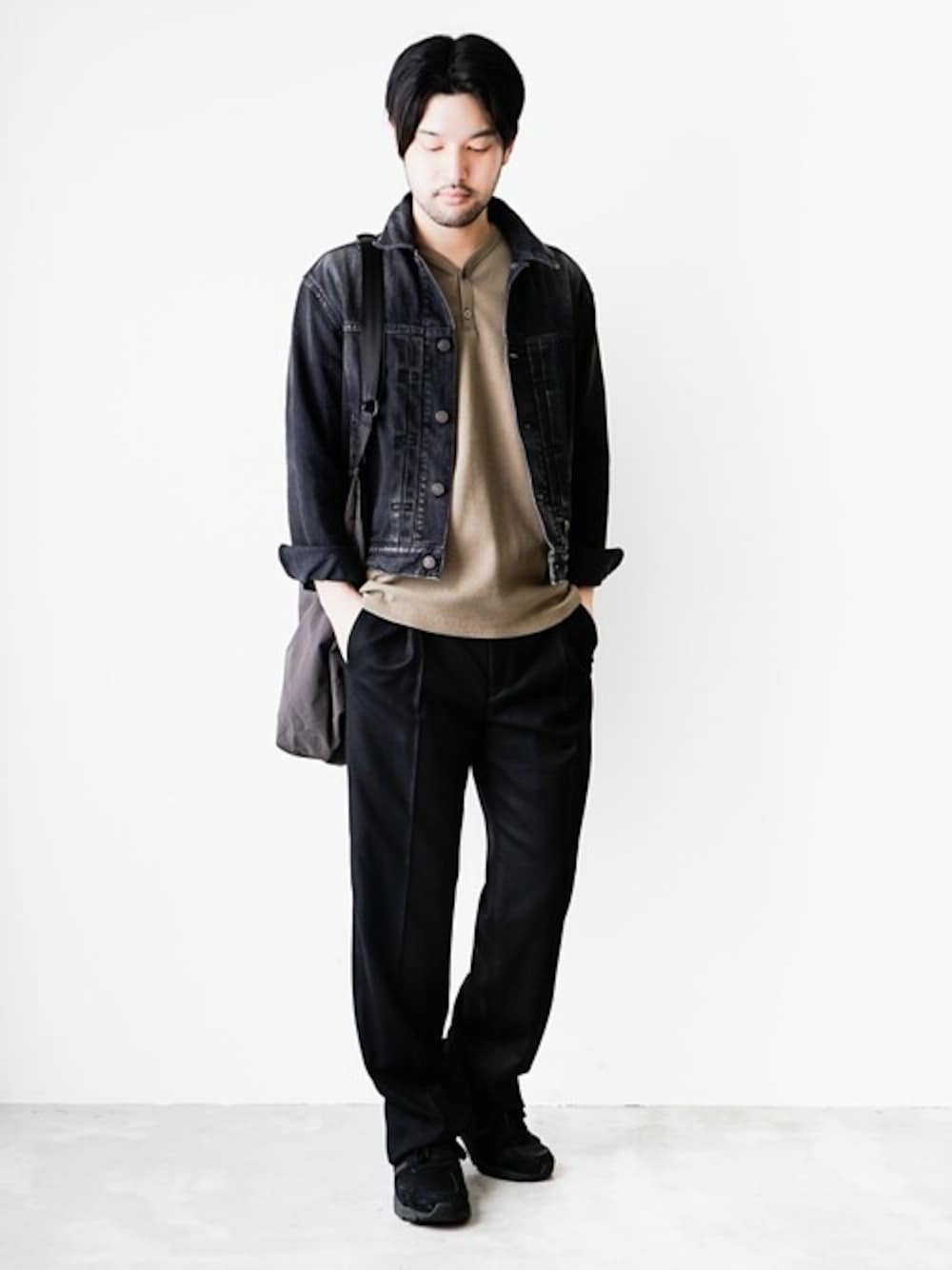 シャープなデニムジャケットを使った大人スタイル。 ラフさのあるカーキヘンリーネックでこなれ感を。