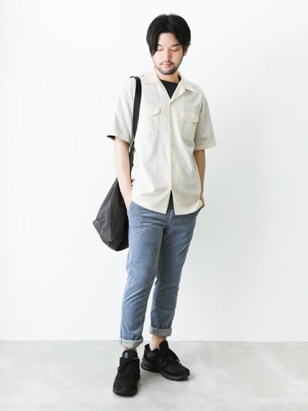 ホワイトの半袖シャツを使った夏スタイル。 ブルーのコーデュロイパンツでスタイリングに厚みと夏らしい爽やかさを。