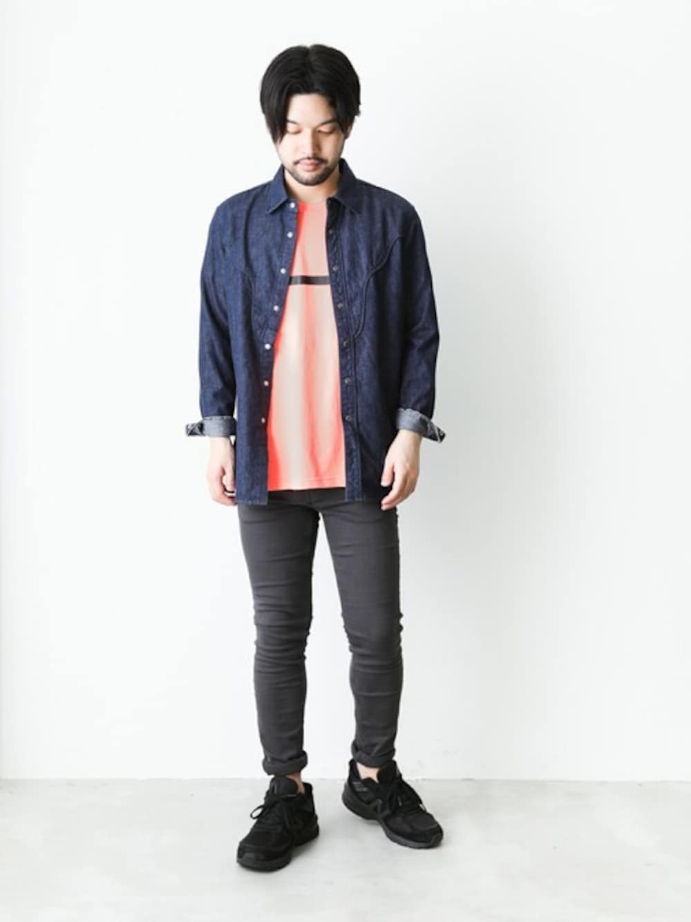 都会的な印象を受けるインディゴ×チャコールはオススメの色合わせ。 鮮やかカラーのインナーでスタイリングに切れ感を。
