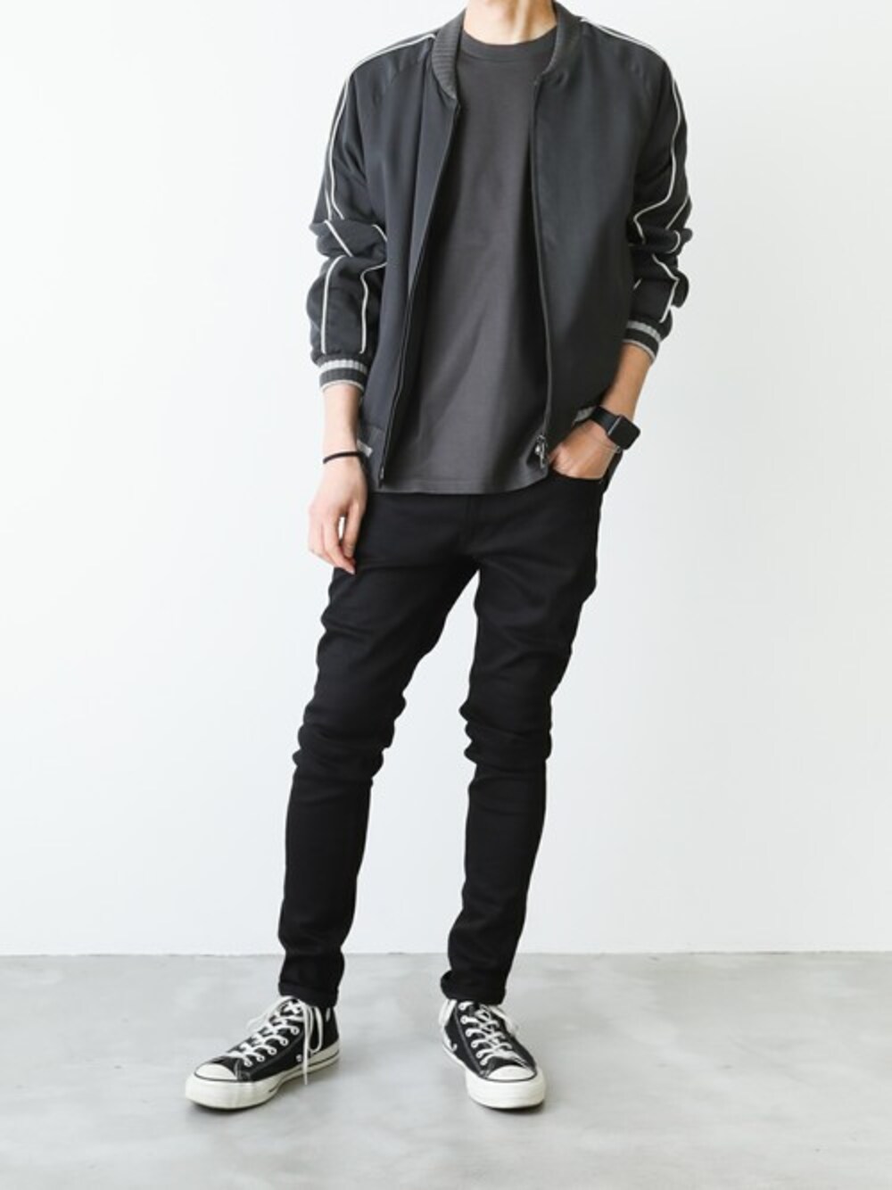 軽い着心地のシンプルなスカジャンスタイル。 春先にイージーに着れるスタジャンはとても便利。 シンプルなデザインでベーシックに着回せる使えるアイテム。 トーンを合わせて大人っぽいスタイルに。
