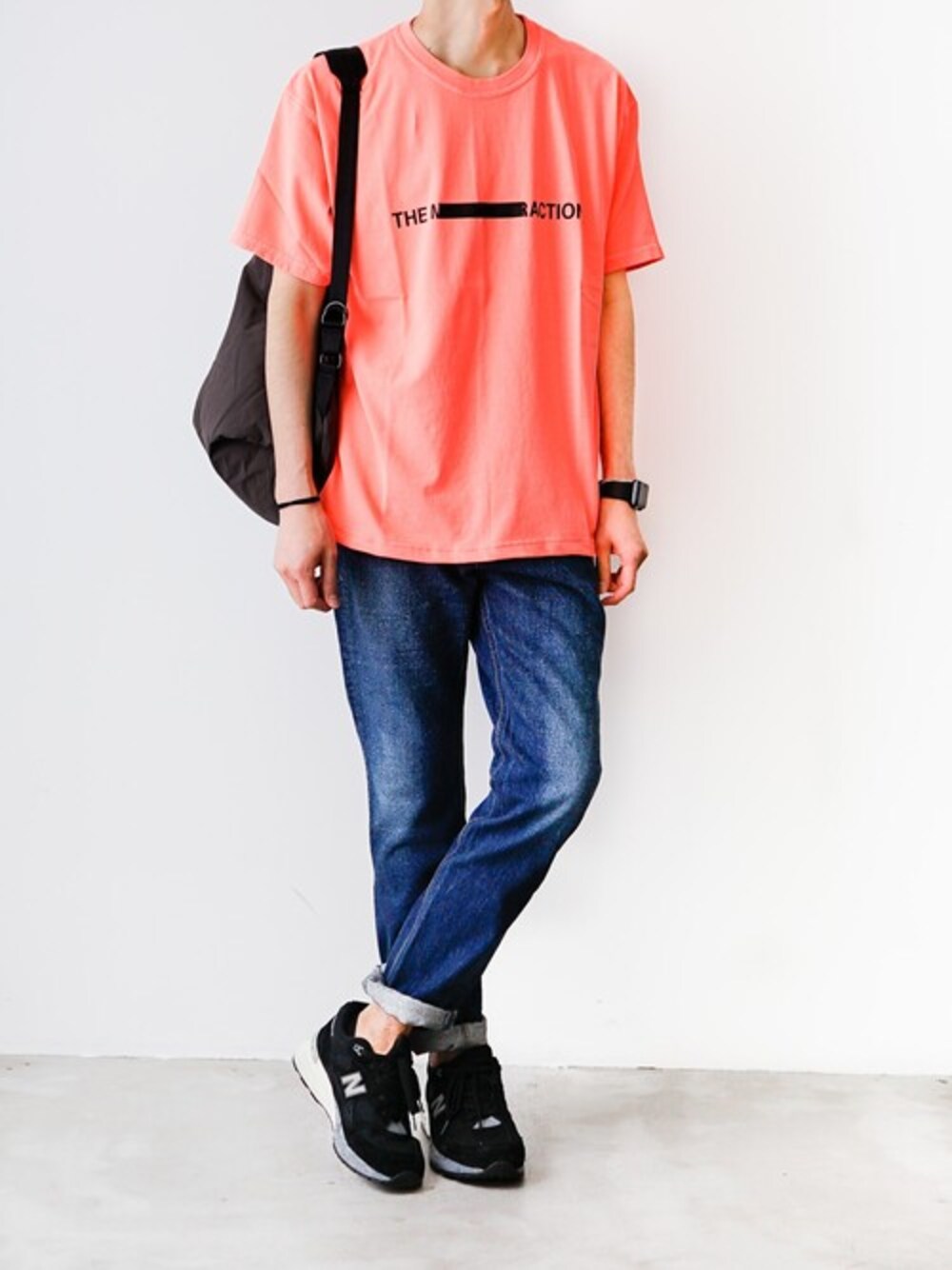 夏らしいピンクTシャツのスタイル。 製品染めのピンクなので、ビビット過ぎず大人っぽく着こなせます。 ストレートデニムに合わせて、涼しく快適にな夏コーデに!