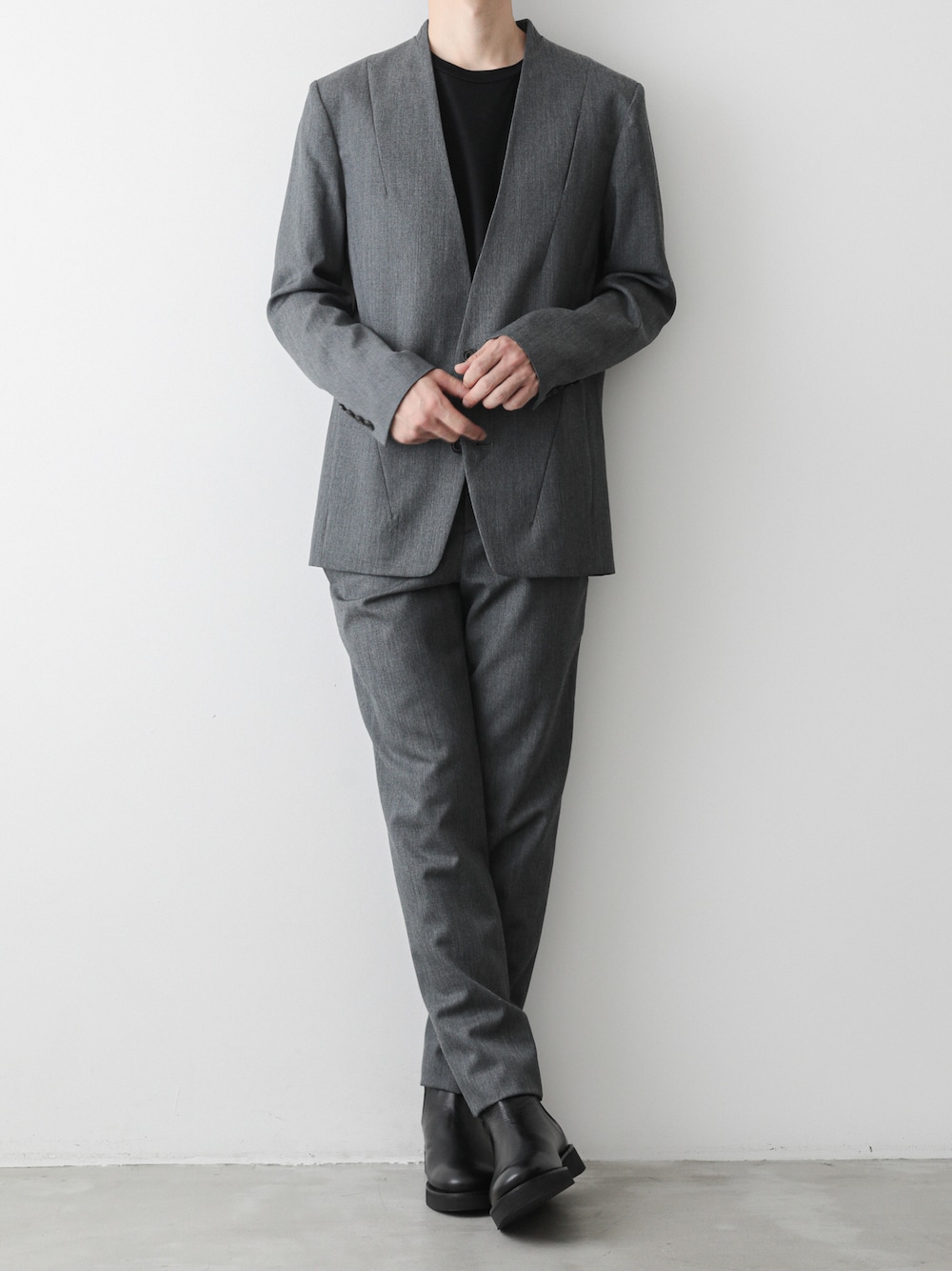 ちょっとした打ち合わせやパーティーに活躍する、綺麗めだけど、かっちりし過ぎないノーカラージャケットのセットアップ。 目面のきれいなカットソーを合わせて程よくラフなイメージに。