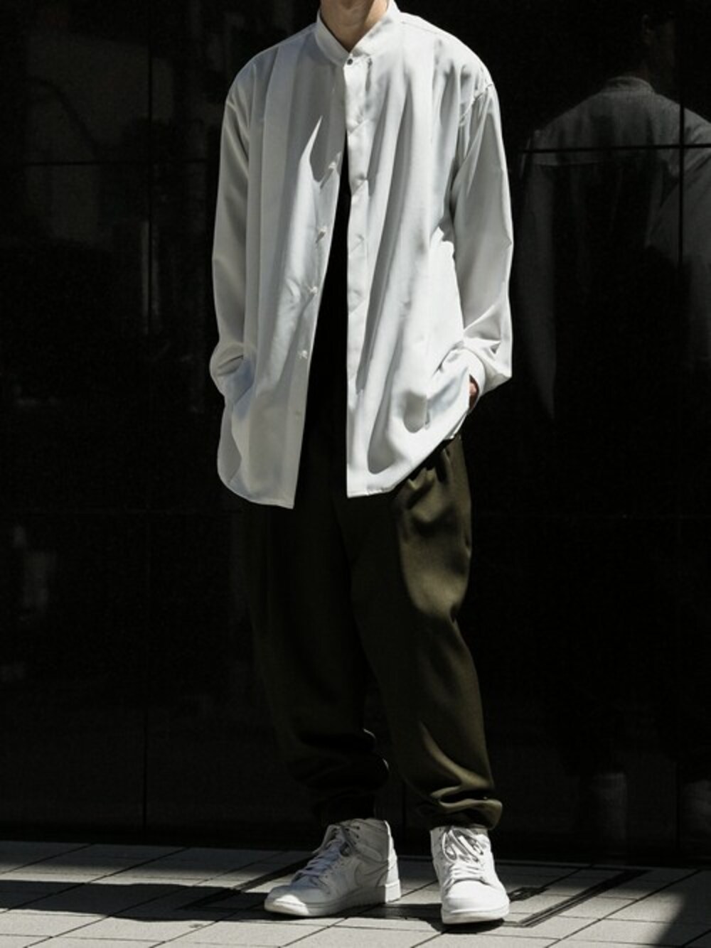 ドレープが美しいオーバーサイズドバンドカラーシャツ。 トレンドのミリタリーカラーも、 ディープタックのウールパンツで取り入れることできれいめな印象に。 ■SHIRT - OVERSIZED BAND COLLAR SHIRTSのホワイト size46 ■TOPS - SLIT PULL-OVER Tのブラック size46 ■BOTTOM - WOOL 2TACK TAPERD PANTSのカーキ size46