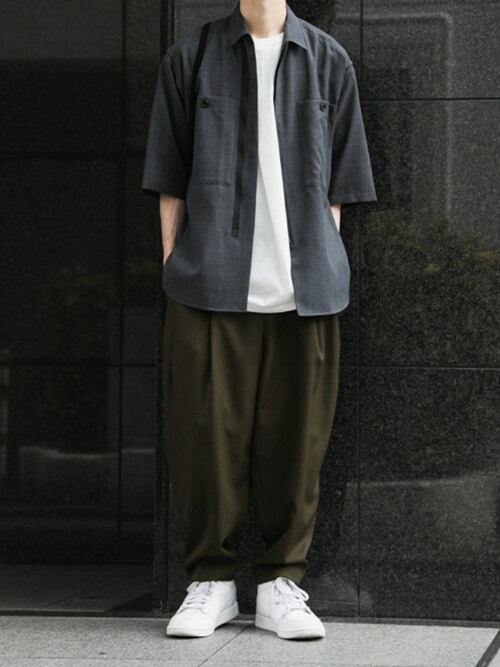 TR素材で上品に仕上げたハーフスリーブのユーティリティシャツ×新型のタックテーパードパンツ。 ミリタリーテイストながらatoらしい綺麗な印象のアイテムです。 ■SHIRT - ZIPUP SHORT SLEEVE SHIRTのダークグレー size46 ■TOPS - METALCOLOR BUTTON DRAPE T-SHIRTのホワイト size46 ■BOTTOM - WOOL 2TACK TAPERD PANTSのカーキ size46 着用 173cm 55kg